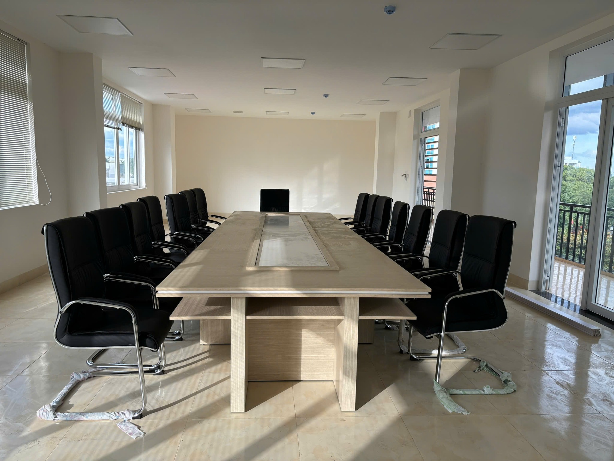 Kiểu dáng: Bàn họp lớn, mặt bàn ghép tạo điểm nhấn giữa. Chân bàn ghép hộp chắc chắn.