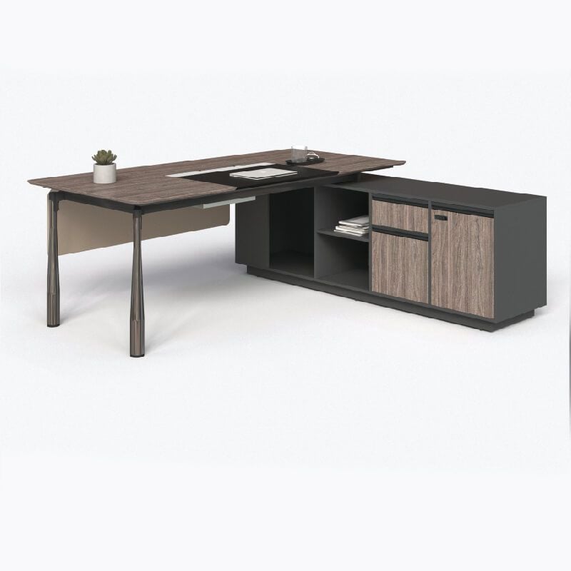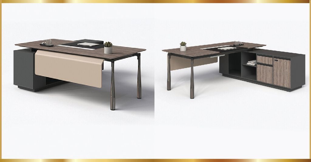 Bàn lãnh đạo có tủ phụ, mặt bàn gỗ MFC 2 lớp, lớp trên dày 17mm cạnh vát chéo có ghép tấm da ở giữa, lớp dưới dày 25mm. Chân kiểu gậy bóng chày mạ inox màu nòng súng liên kết bằng khớp nhôm hợp kim với khung mặt bàn. Yếm bàn làm từ khung sắt bọc da. Có máng điện và ổ điện.