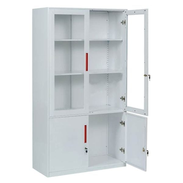 Tủ hồ sơ thép sơn tĩnh điện màu trắng sáng phù hợp với không gian văn phòng hiện đại. Tủ có khoang trên là cánh kính với 2 đợt di động, khoang dưới 2 cánh sắt mở