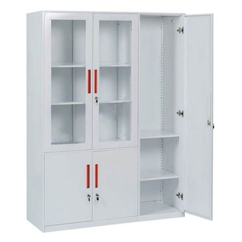 Tủ hồ sơ thép sơn tĩnh điện màu trắng sáng phù hợp với không gian văn phòng hiện đại. Tủ được thiết kế gồm 3 khoang với 1 khoang cánh kính mở có 2 đợt di động, khoang bên dưới là 2 cánh sắt mở và 1 khoang mở cánh dài có suốt treo quần áo, 2 đợt cố định