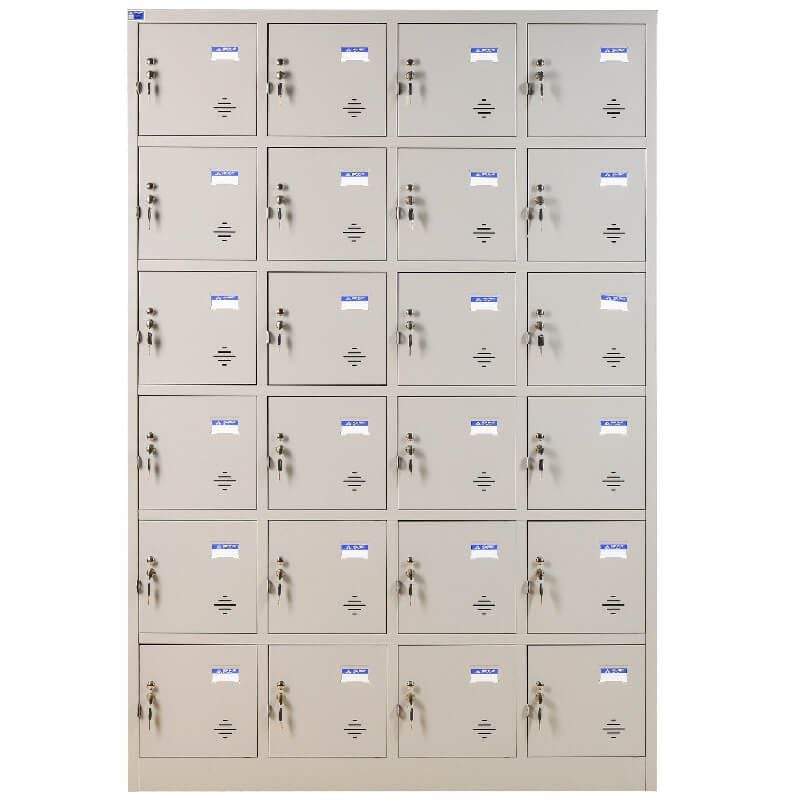 Tủ sắt sơn tĩnh điện 24 khoang cánh mở, Trên mỗi cánh có 1 khóa Locker, núm tay nắm và tai khóa móc
