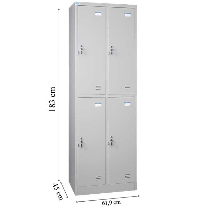 Tủ sắt sơn tĩnh điện 2 khoang cánh mở, bên trong mỗi khoang có 1 đợt cố định và 1 suốt treo quần áo. Trên mỗi cánh có 1 khóa Locker, núm tay nắm và tai khóa móc
