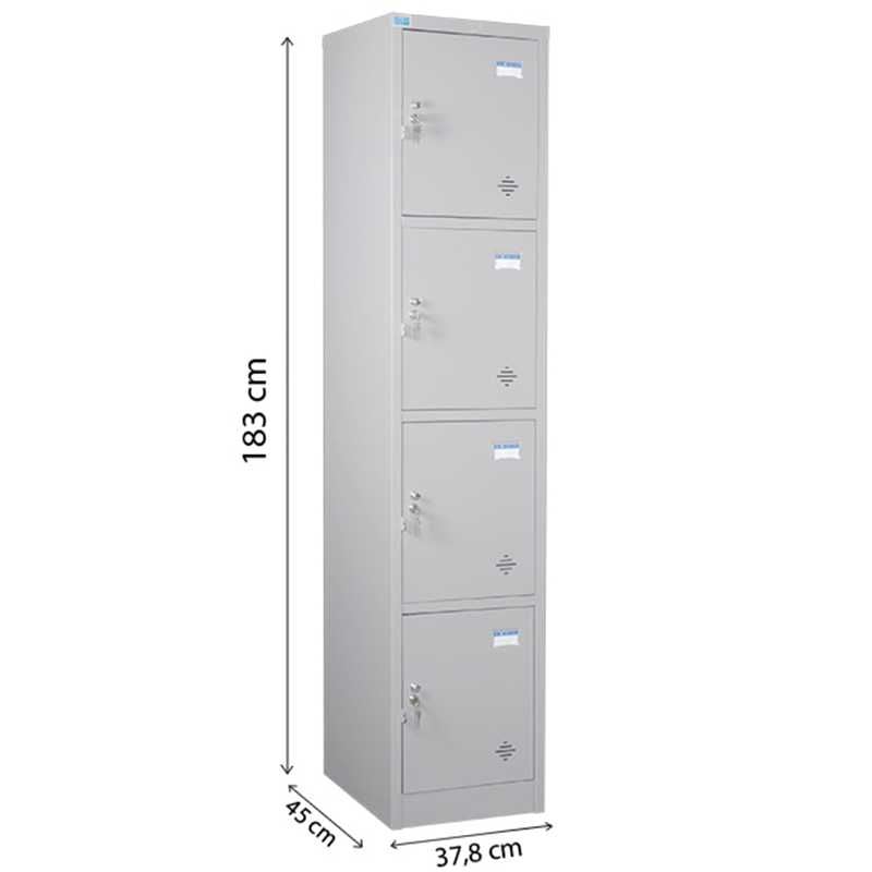 Tủ sắt sơn tĩnh điện 4 khoang cánh mở. Trên mỗi cánh có 1 khóa Locker, núm tay nắm và tai khóa móc