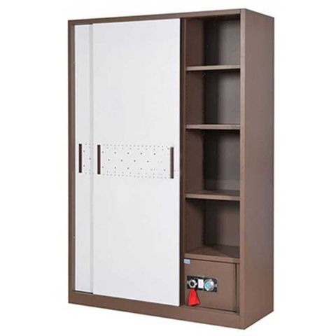 Tủ sắt gia đình 2 cánh lùa thân sơn màu cà phê kết hợp cánh mầu trắng có hoa văn trang trí hiện đại